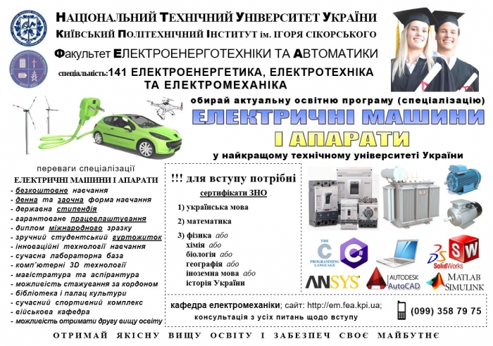 Кафедра ЕЛЕКТРОМЕХАНІКИ, Факультету електроенерготехніки та автоматики, Національного технічного університету України «Київський політехнічний інститут імені Ігоря Сікорського» пропонує Вам співпрацю з метою підготовки, розвитку та виховання висококваліфікованих кадрів для української енергетики та промисловості. Ми запрошуємо випускників, здобути вищу технічну освіту у галузі електрична інженерія, за рахунок державного бюджету.