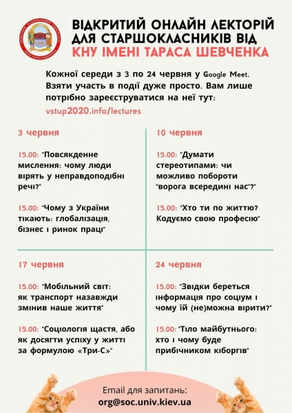 Саме тому факультет соціології Київського національного університету імені Тараса Шевченка вирішив підготувати серію невеличких онлайн-лекцій для учнів 9,10 та 11 класів усіх українських шкіл. Ці онлайн-зустрічі відбуватимуться щосереди з 15.00 до 16.00.