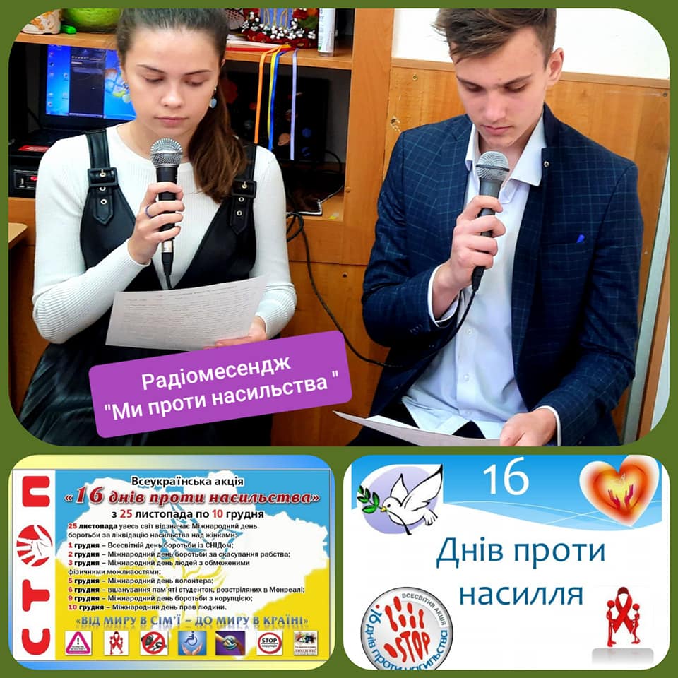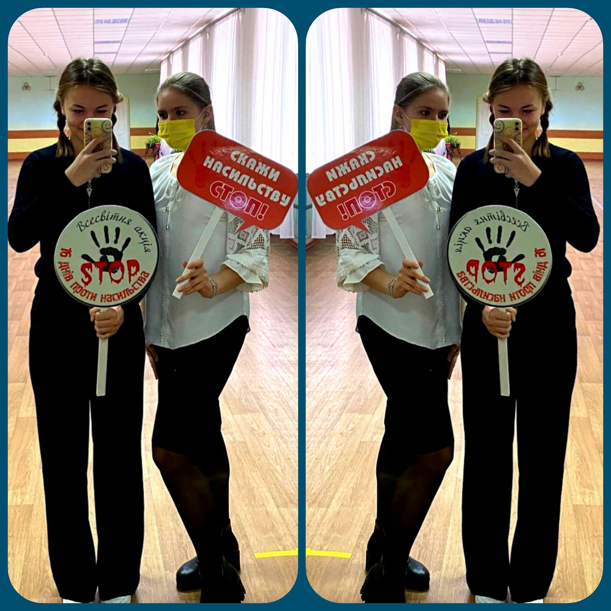 У гімназії розпочали цю акцію заходи: радіомесендж "Ми проти насильства" та фоточелендж "Скажи насильству - НІ"