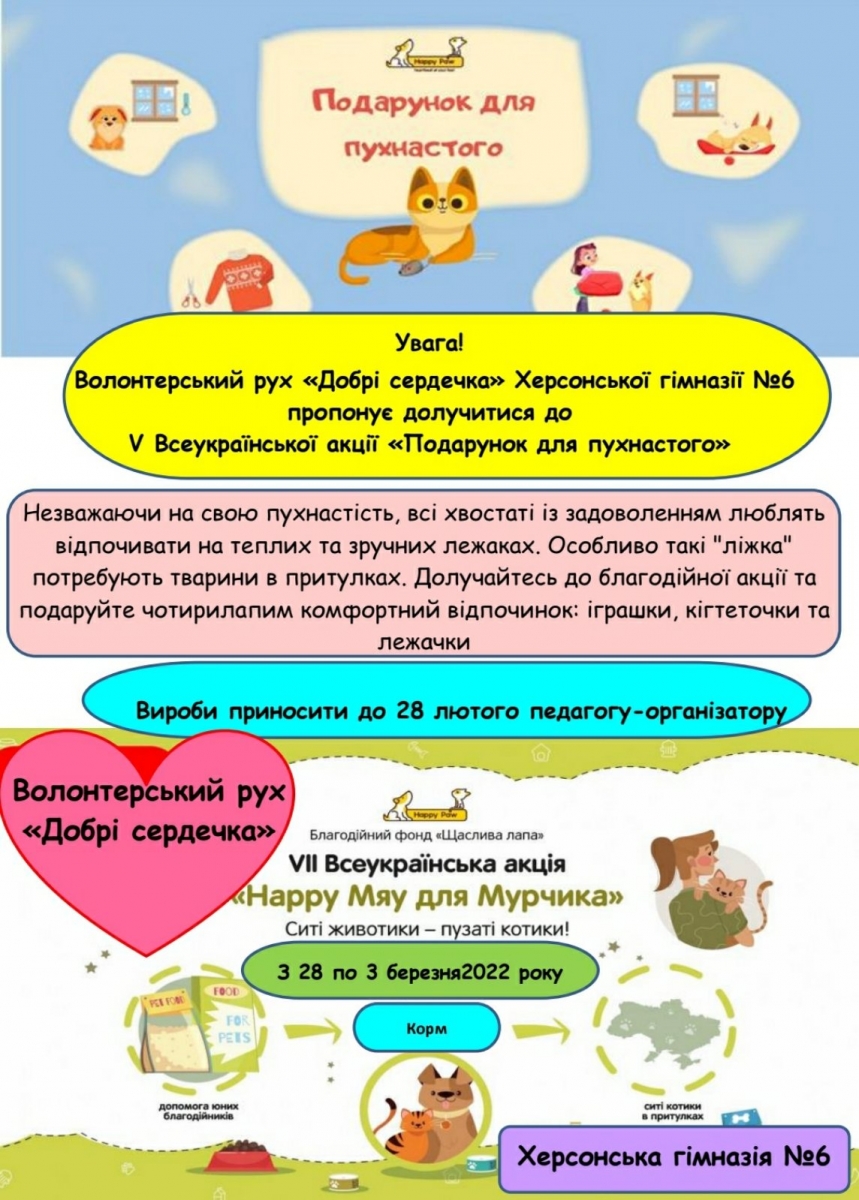 Волонтерський рух «Добрі сердечка» Херсонської гімназії №6 постійно допомагає притулкам безпритульних тварин. Нещодавно ми проводили благодійні акції та допомогли притулкам «Кот Бегемот» та ХТЗТ «4 ЛАПИ» у м.Херсоні. Гімназистами було зібрано 380 кг корму та медикаменти на суму 2324 грн. Діти з радістю долучилися до акції і ті, хто мав змогу та бажання особисто відвезли їх до притулку. Відеозвіти ви можете переглянути нижче за посиланнями!
