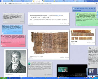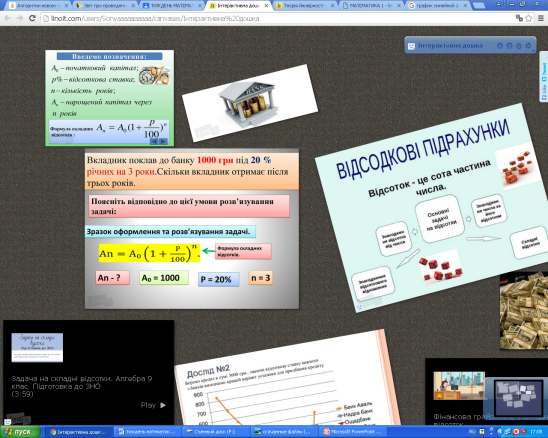 Учні 9-х класів створювали проекти з наступних тем: «Банківські операції нарахування простих і складних відсотків», «Імовірність отримання позитивної позначки при написанні тестової контрольної роботи шляхом вгадування правильної відповіді», «Значення прогресій у банківській справі» в середовищі Lino (вчитель Чихун А.О.).