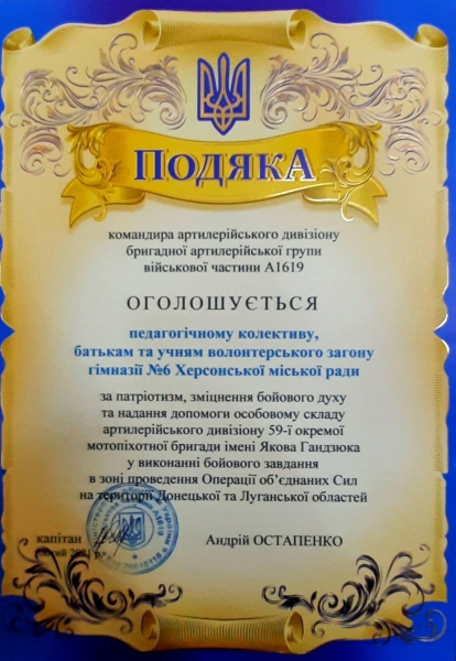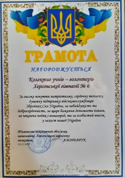 На цьому заході було відзначено колекив Херсонської гімназії №6, учнів та батьків, які впродовж 7-ми років небайдужі до долі України та надають волонтерську допомогу ЗСУ на Сході. Учнів-волонтерів, колектив гімназії було нагороджено грамотами від військових частин й висловлено слова подяки за систематичну волонтерську допомогу та високий рівень патріотизму!