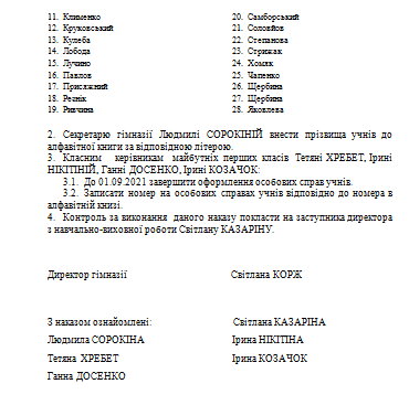 НАКАЗ ДИРЕКТОРА ГІМНАЗІЇ "ПРО ЗАРАХУВАННЯ УЧНІВ ДО 1-Х КЛАСІВ"