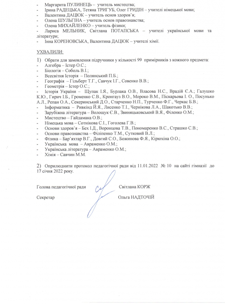 ВИТЯГ З ПРОТОКОЛУ "Про вибір та замовлення підручників для здобувачів повної загальної середньої освіти і педагогічних працівників у 2021-2022 роках (9 клас)"