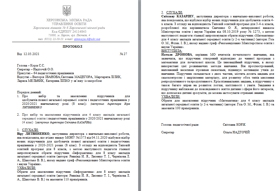 Протокол та результати вибору та замовлення підручників для 4, 8-х класів