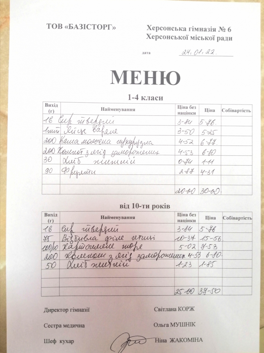 МЕНЮ ЗА БЮДЖЕТНІ КОШТИ 24 СІЧНЯ 2022 РОКУ
