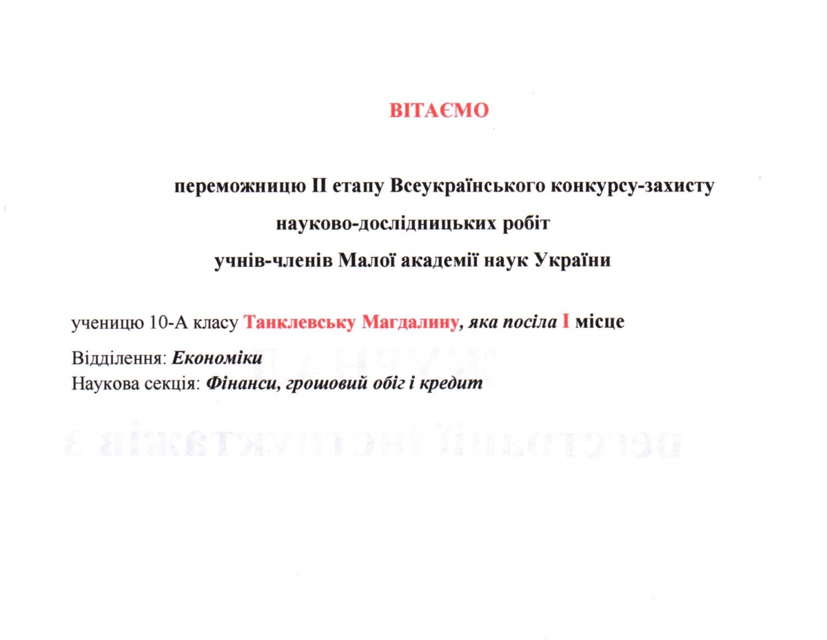 ВІНІЧЕНКО Анну, ученицю 10-А класу, яка посіла І місце у