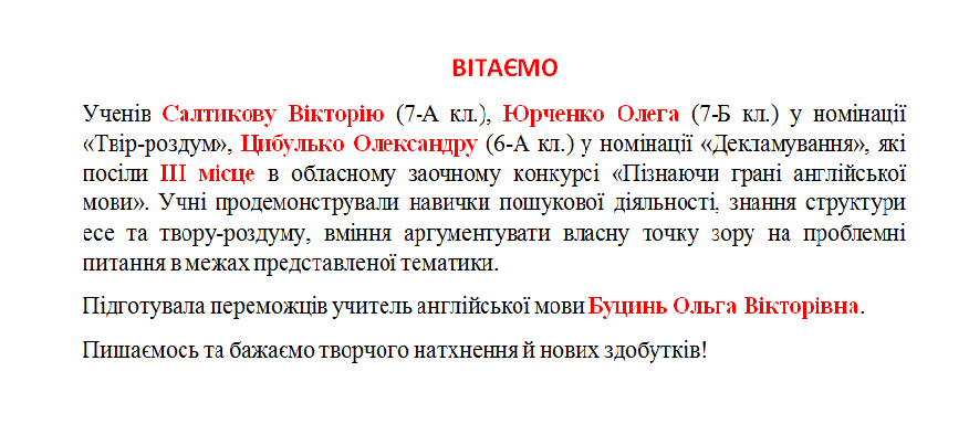 Переможців підготувала вчитель англійської мови Думанська Аліса Василівна.