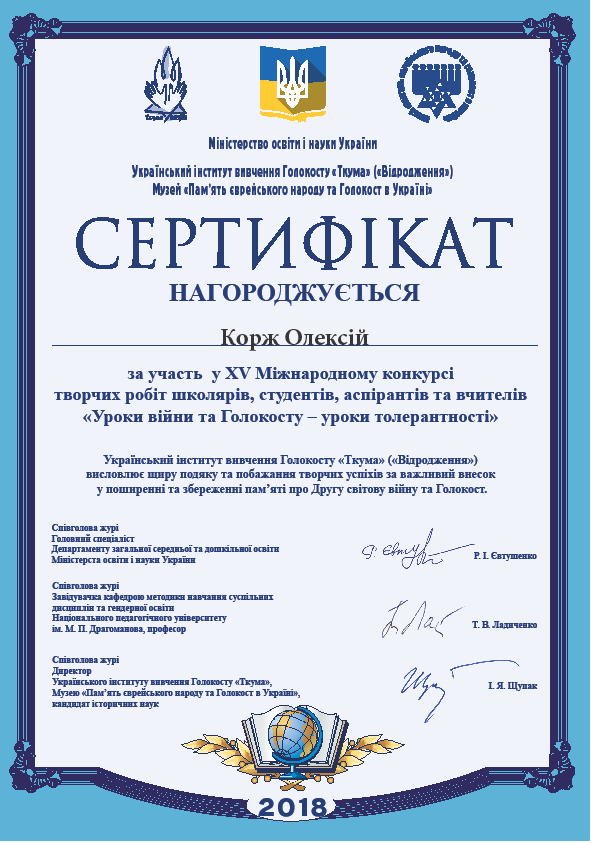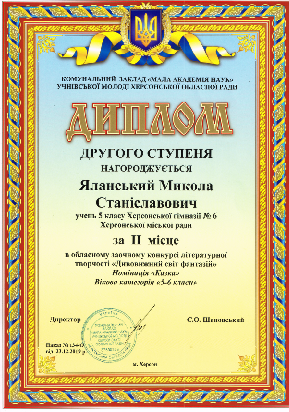 ВІНІЧЕНКО Анну, ученицю 10-А класу, яка посіла ІІ місце у ІІ етапі ХІ Міжнародного мовно-літературного конкурсу учнівської та студентської молоді імені Тараса Шевченка, яка продемонструвала творчий потенціал та глибокі знання творчості Т. Шевченка.