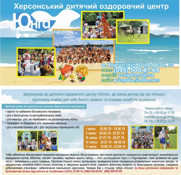 ХЕРСОНСЬКИЙ ДИТЯЧИЙ ОЗДОРОВЧИЙ ЦЕНТР «ЮНГА» запрошує дітей до літнього табору відпочинку!