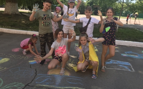 Перший день літнього табору пройшов чудово. Всі діти відвідали планетарій,  вони із задоволенням переглянули пізнавально – розважальний мультфільм «Зачарований риф». Після обіду асфальт шкільного подвір’я «розквітнув» щирими дитячими малюнками. Креативність та фантазію дітвора також проявила в конкурсі на найкраще лого загону.