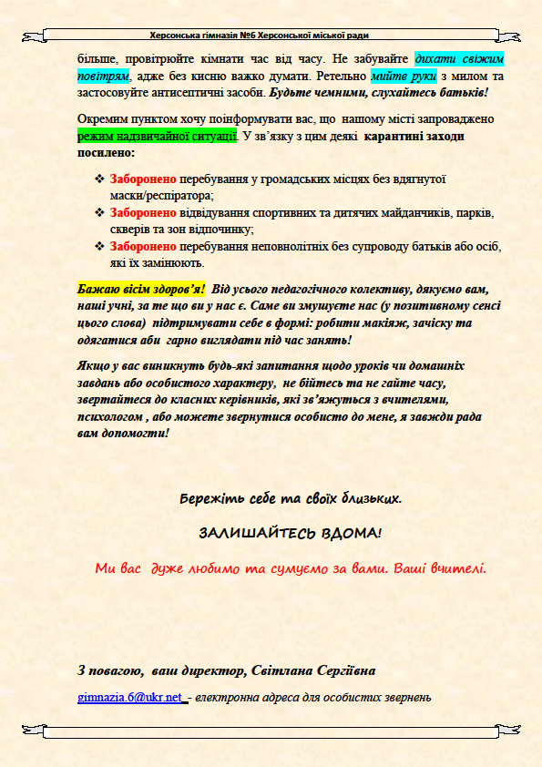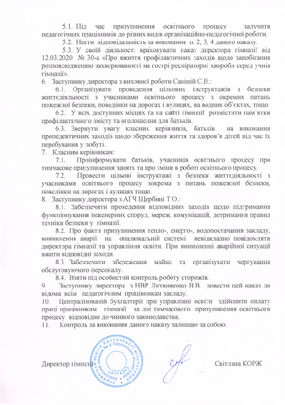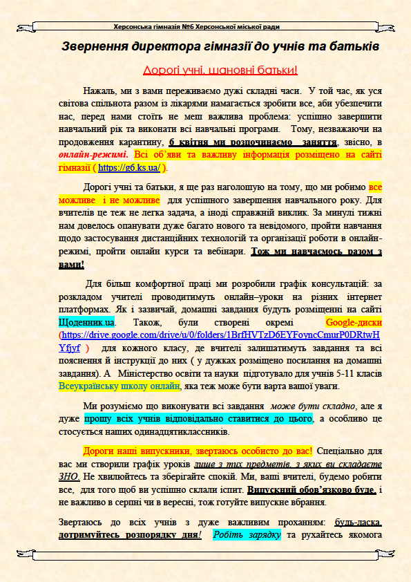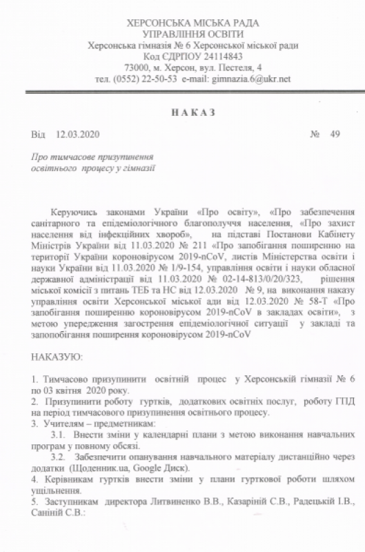 Наказ про тимчасові зміни у режимі роботи гімназії та переведення працівників на гнучкий графік роботи (дистанційно) на період призупинення освітнього процесу (карантин)