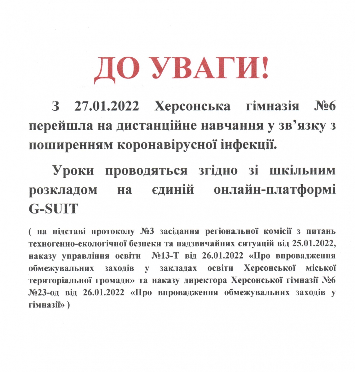 Робота гімназії у дистанційному режимі організована на єдиній платформі G-Suit та охоплює як навчальний, так і виховний процес. Детальніше