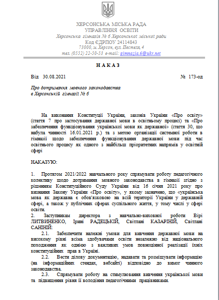 Н А К А З директора гімназії " Про дотримання мовного законодавства в Херсонській гімназії №6"
