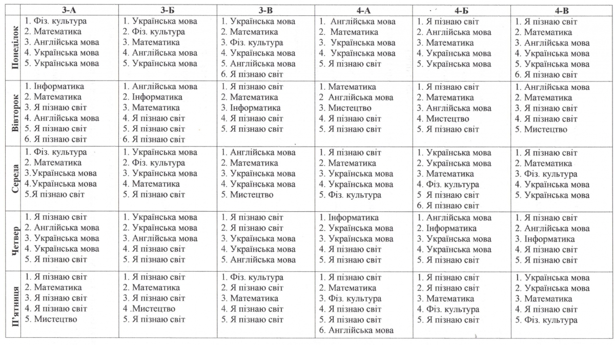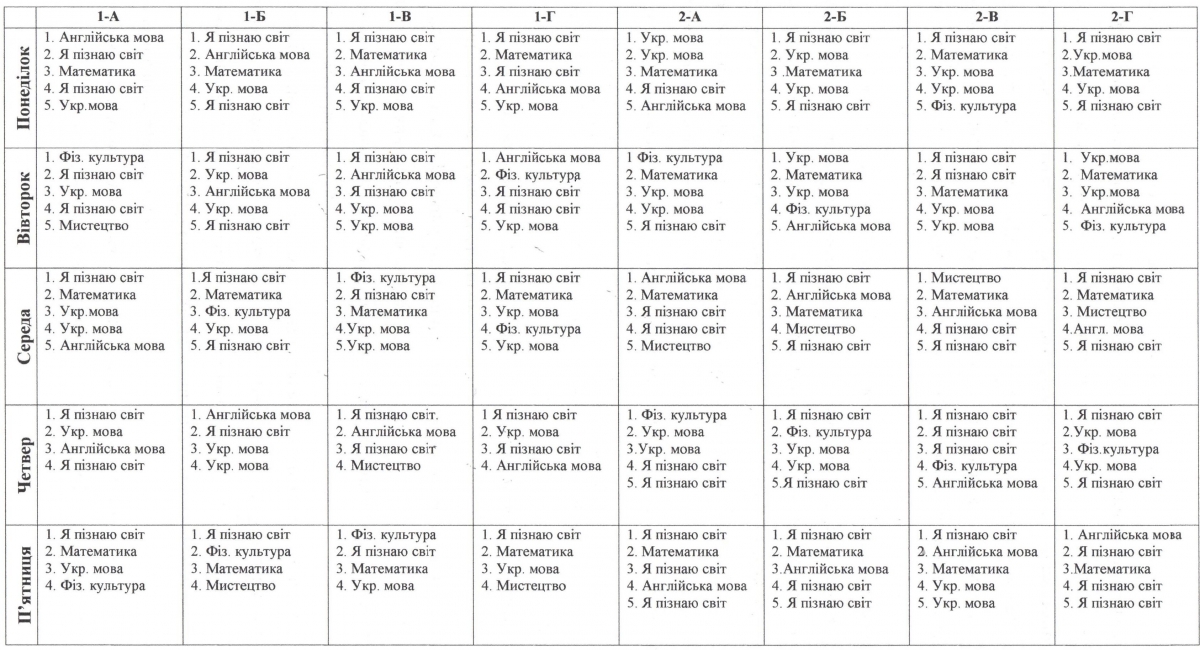 РОЗКЛАД УРОКІВ ПОЧАТКОВОЇ ШКОЛИ У 2021/2022 НАВЧАЛЬНОМУ РОЦІ