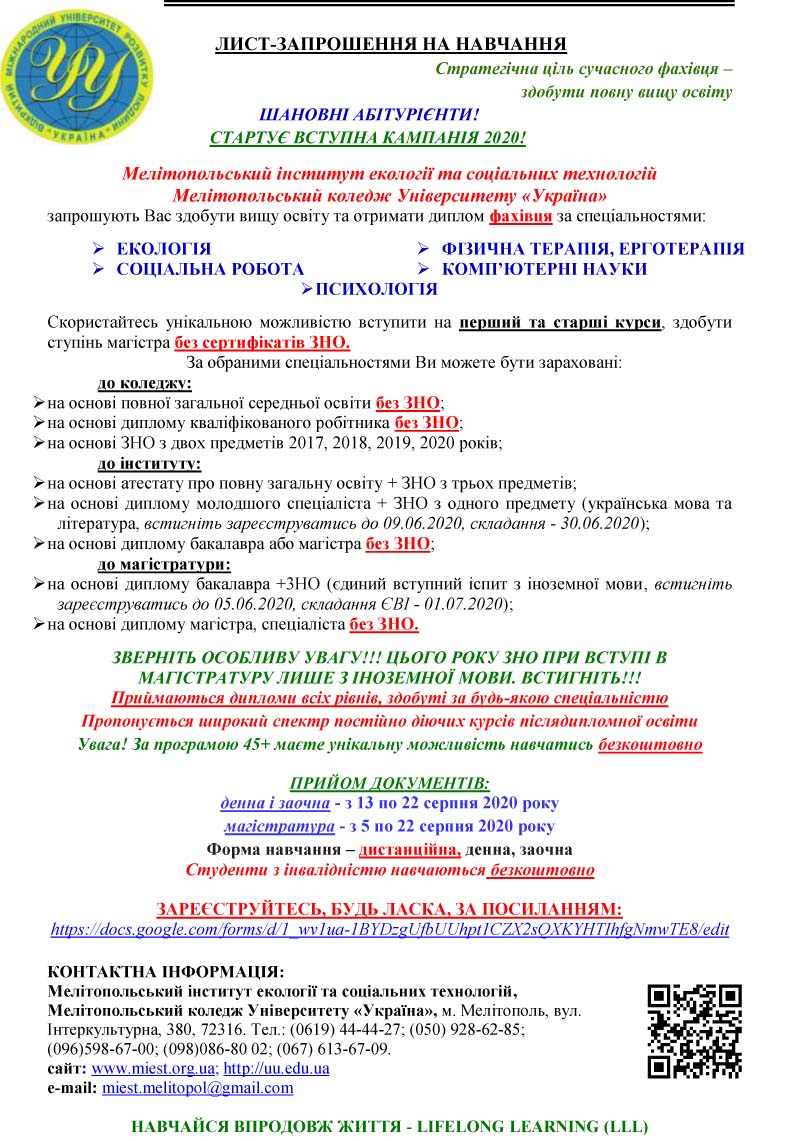 Мелітопольський інститут екології та соціальних технологій запрошує