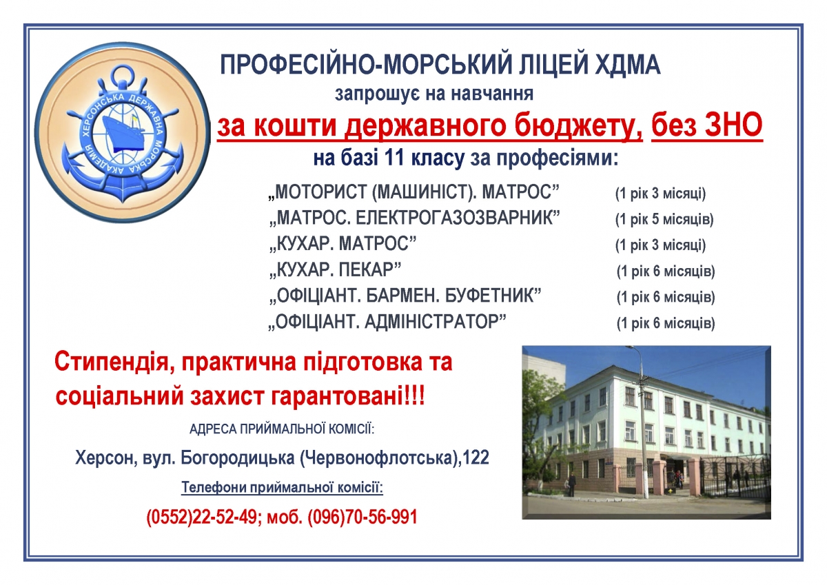 ПРОФЕСІЙНО-МОРСЬКИЙ ЛІЦЕЙ ХДМА запрошує на навчання