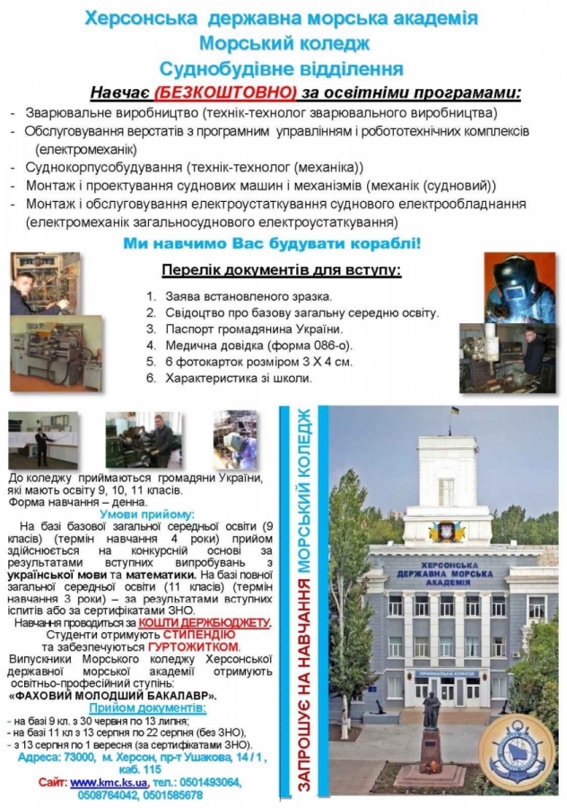 Запрошуємо на навчання до Суднобудівного відділення Морського коледжу ХДМА