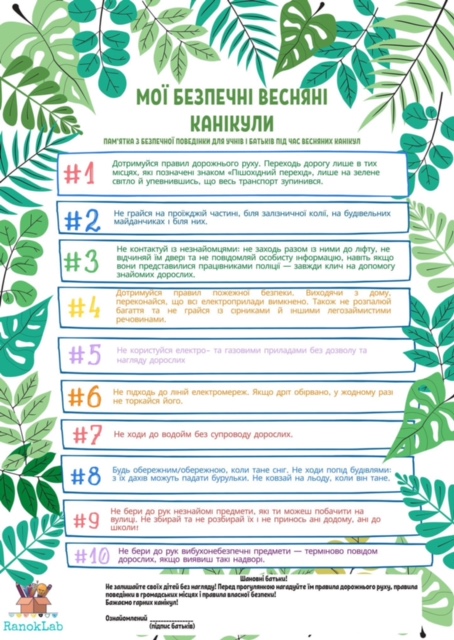 Перед початком весняних канікул до гімназії завітали шкільні офіцери поліції Грибко В.В., Клімова А.В., Ненько А.В. та Луняка І.О., які завітали до учнів молодших класів. Інспектори провели з дітьми цікаві ігри та профілактичні бесіди на такі теми: «Увага! Безпечні канікули!», «Правила дорожнього руху» й «Правила поведінки з незнайомими людьми».